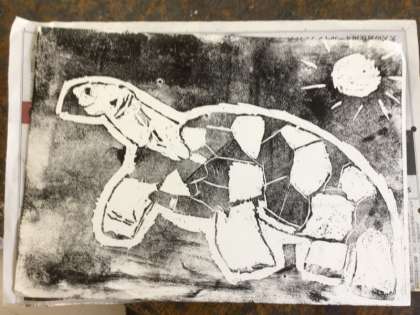 4年生の図工では、版画に取り組んでいます。児童は、動物の絵を描き、それを版木に写して掘りました。