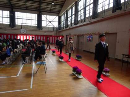 卒業生は、赤いじゅうたんの上を踏みしめながら、大きな拍手に送られて退場しました。
