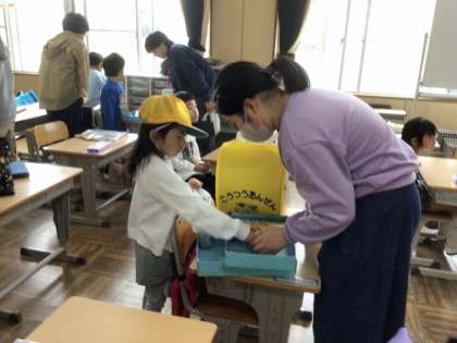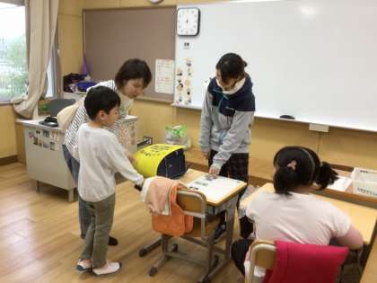 毎朝、6年生は登校するとすぐに1年生教室に行きます。6年生は、1年生の朝の準備を手伝います。かばんを一緒に開けて、提出物を一緒に出しに行きます。また、かばんを一緒にロッカーにしまいます。