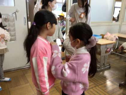 最後に、6年生はひざまずいて、1年生に名札をつけてあげます。1年生はとってもうれしそうです。