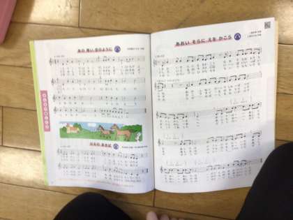 2年生の音楽は、学年で行う時と、各学級で行う時とあります。4/10の授業では、学年で「あの青い空のように」を歌いました。