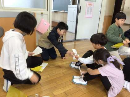 6年生は毎日、1年生の活動のお手伝いをしています。4/12の朝、6年生と1年生は「名刺交換」をしました。お互いの名前を覚え、もっと仲良くなるためです。6年生は、「好きな動物は?」「好きな色は何?」と、1年生に質問をしていました。