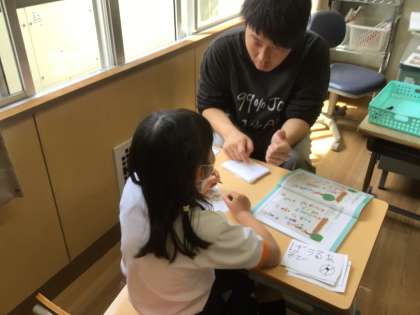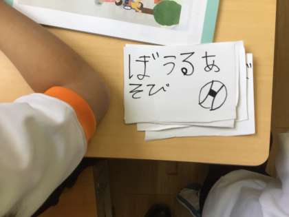 特別支援学級2年生の生活科では、好きな遊びしらべを行いました。自分が日ごろ遊んでいる遊びを思い浮かべながら、「かくれんぼ」「たけうま」「ぼうるあそび」などと、カードに書きました。