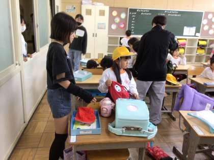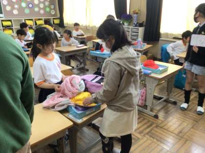 1年生は、朝、登校するとすぐに朝の準備を始めます。6年生がたくさんお手伝いをしてくれてきましたが、最近ではずいぶんと自分一人で準備をすることができるようになってきました。1年生、がんばっています。