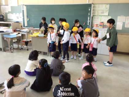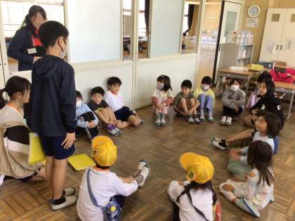 フレンドはじめの会では、最初に各フレンド班のマスコットキャラクターが発表されました。次に、1年生の自己紹介を聞きました。1年生は、名前とともに好きな動物と好きな食べ物を発表しました。続いて、上級生も自己紹介をしました。