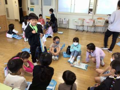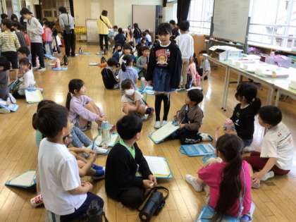 はじめの会の後、フレンド班ごとに車座になって、自己紹介をしました。