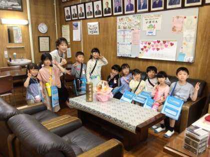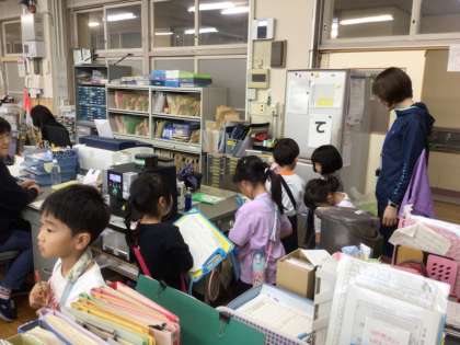 1・2年生児童は、校長室や職員室も探検しました。校長室では、班ごとに校長先生と写真を撮りました。