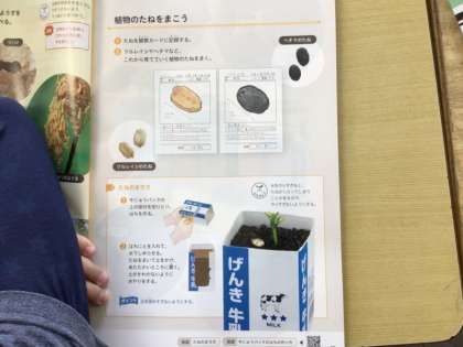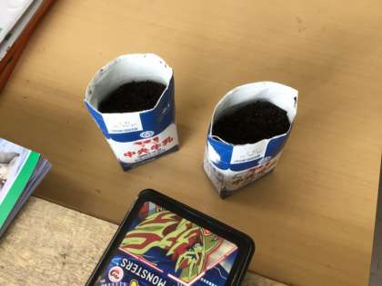 4/30の授業では、ツルレイシの種の植え方を学び、牛乳パックの中に土を入れ、実際に種を入れました。