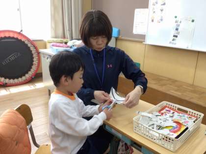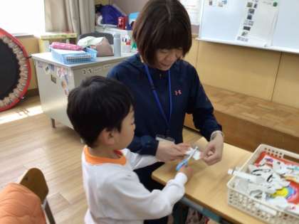 特別支援学級1年生では、自立活動としてはさみの使い方練習をしました。先生が持っている紙を、丁寧にはさみで切りました。