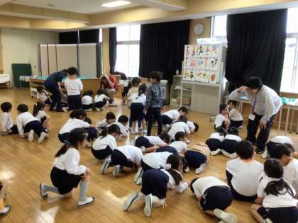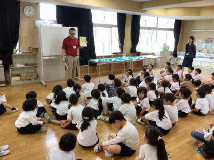1年生は、1か月に1回程度、ALTの先生と英語を勉強しています。5/7の授業では、英語で数を数えたり、曜日の言い方を教わったりしました。最後に英語の歌を歌いながら、ジェスチャーをして楽しみました。