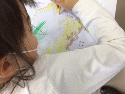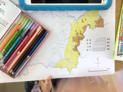 3年生の社会科では、豊田市について学習しています。5/7の授業では、豊田市の白地図の「高地」「台地」「低地」「湖・川」を、色分けしました。「豊田市って広いなあ〜」と、色を塗りながらつぶやいていました。