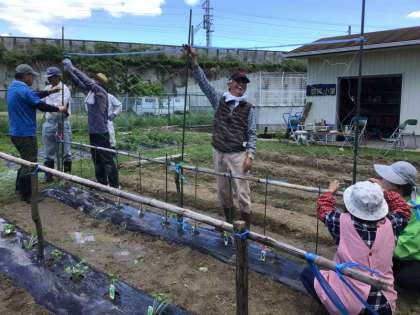 野菜名人さんが支柱を立て、ネットを張ってくださいました
