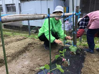 1・2年生が野菜の苗を植えた後、野菜名人さんは児童が植えた苗の隣に支柱を立て、苗を支柱をタフロープで柔らかく結わえました。また、大きな支柱にネットをかけ、キュウリのツルがのぼっていけるようにしました。