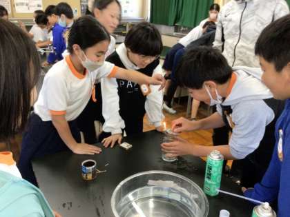 5/8の授業では、児童が水上置換法で集気びんに酸素、窒素、二酸化炭素を集めました。それぞれの気体の中で、ろうそくの炎がどのようになるかを観察しました。酸素の中で激しく燃える炎を見たとき、児童からは驚きの声があがりました。