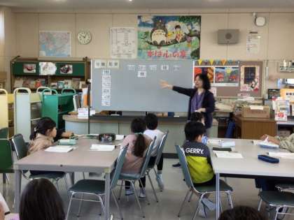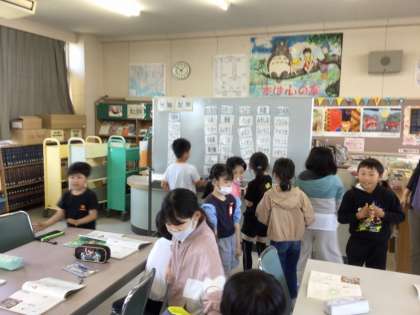 3年生にしては難しい言葉が多かったため、児童にカードを配り、そのカードがどのグループに属するかを分類するゲームを行いました。児童はこのゲームを通して、図書室の本もジャンルごとに分類されており、そうすることによって探しやすくなっていることを学びました。