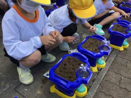 植木鉢に土と肥料を入れ、人差し指で穴を6こあけて、1つの穴に1粒ずつ種をまきました。1年生は優しく土をかけながら、「早く芽がでてきてね」と、声をかけていました。