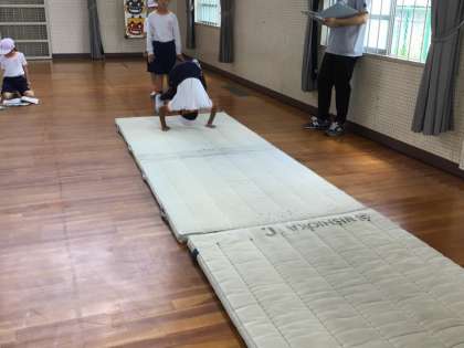 3年生の体育では、マット運動を行っています。5/16の授業では、今まで練習してきた技を組み合わせて、テストを行いました。児童は、開脚前転や開脚後転を次々と決め、最後にピタッとポーズをとっていました。