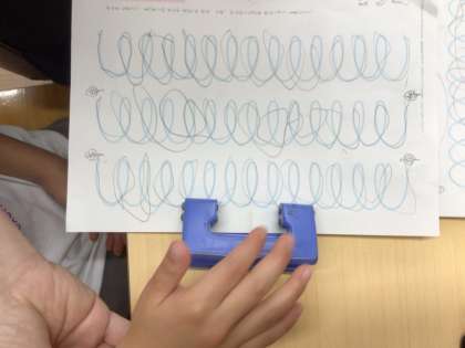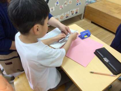 特別支援学級1年生では、自立活動としてなぞり書きを行っています。線からはみ出ないようになぞり書きをして、自分で穴をあけました。プリントをファイルに自分で綴じました。