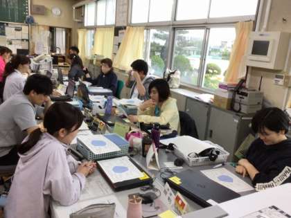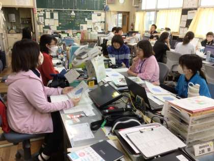 5/16の授業後には、教師が低・中・高学年部に分かれ、それぞれの学級のレーダーチャートを見あって、それぞれの学級の強みや弱みを話し合い、学級力を向上させる方法を考えあいました。