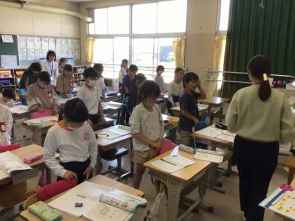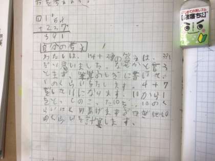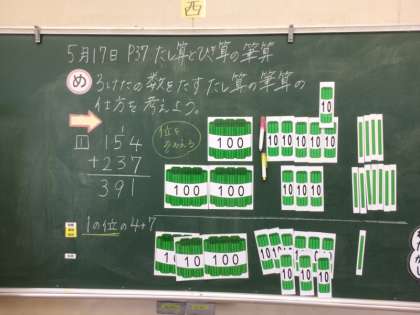 5/17の学習では、154+237の筆算のやり方を考え、児童は自分の考えをノートに書いて、発表していました。