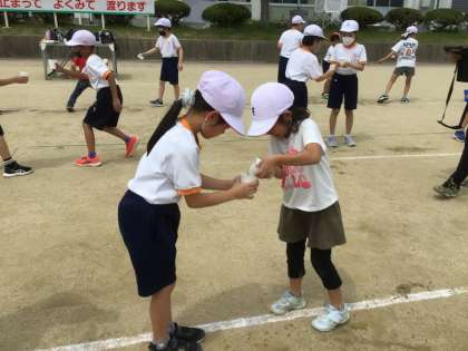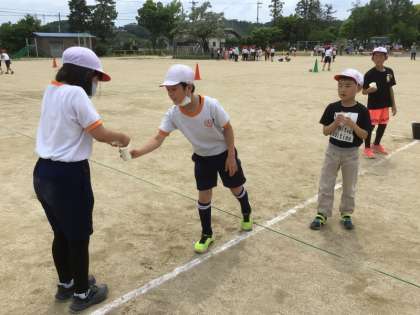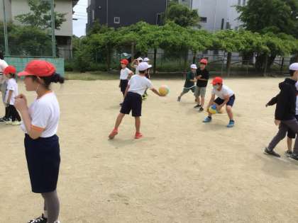 運動場では、ボールを使った鬼ごっこや紙コップを使って水を運んでいく紙コップリレーがありました。