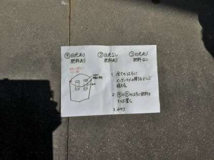 5/24の授業では、3つの条件の前段階として、種まきをしました。発芽したら、日光のある・なしの条件で育てて観察していきます。