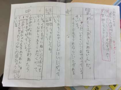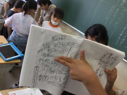 児童は、自分がどんな人なのか、どんなことに興味があるのか、どんなことが得意なのかを知るためにウェビングマップを書きました。そして、それを見ながら、「はじめ」「中」「終わり」を意識して、「わたし」を説明する文章づくりに入りました。