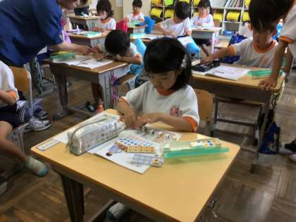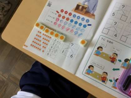 5/24の授業では、「7はいくつと いくつ」「8はいくつと いくつ」を考えました。算数セットに入っている数図ブロックを使って、机の上で分けながら考えて、発表していました。