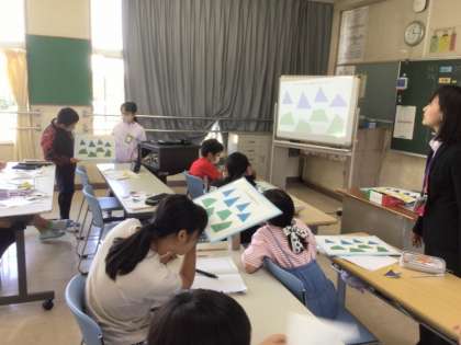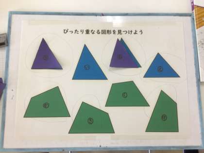6/3の授業では、9個の図形をみて、ぴったり重なる図形を予想しました。そしてぴったりかどうかを確かめる方法を考えました。児童は、図形を切り取って、上に重ねたり、裏返して重ねたりして、確かめました。