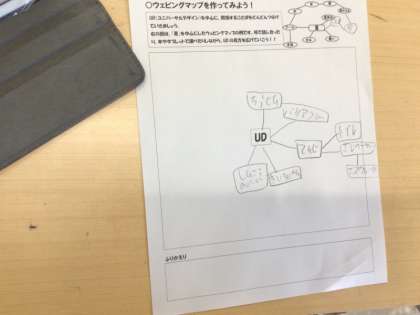 児童は、豊田市にあるスロープや点字ブロックの写真を見て、それがどんな役割をしているのかを考えました。そして、それが「ユニバーサルデザイン」という考えのもと、設置されていることを知りました。児童はユニバーサルデザインについてのウェビングマップを描いて、自分の生活の身近にあるユニバーサルデザインについて考えました。