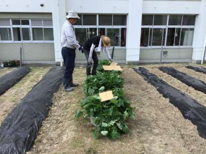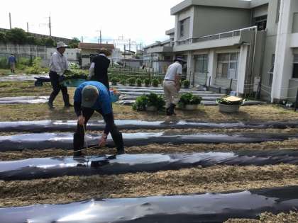 6/7(金)の朝、野菜名人さんはサツマイモの苗植え準備をしてくださいました。児童が植えやすいように、マルチシートに穴をあけてくださいました。野菜名人さんは、サツマイモの苗を、530本も用意してくださいました。