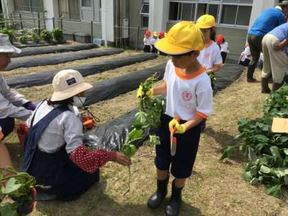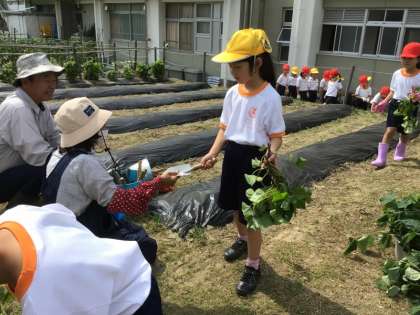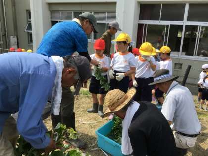 1・2年生は、フレンド班のペアになって畑に入り、野菜名人さんから苗とスコップを受け取りました。