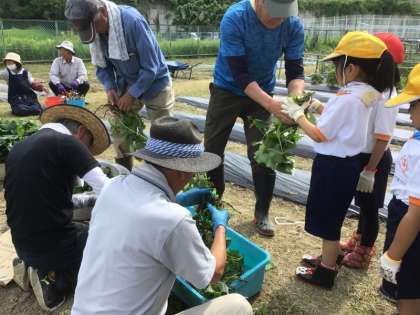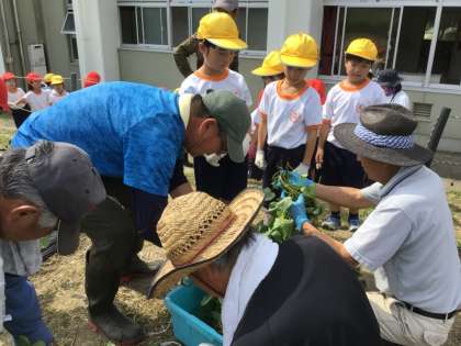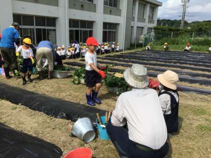児童は苗とスコップを受け取ると、「ありがとう!」とお礼を言いました。