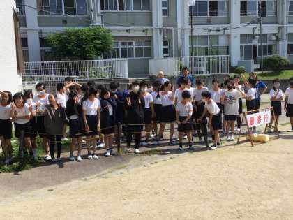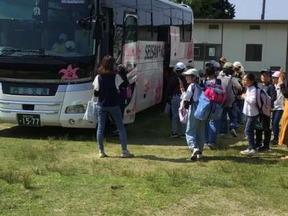 多くの児童・保護者が見送る中、5年生は元気よく出発しました。