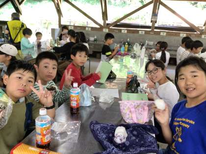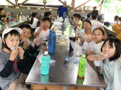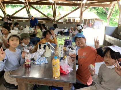 お家の人が朝早く起きて握ってくれたおにぎりを、み〜んなおいしそうにほおばっていました。
