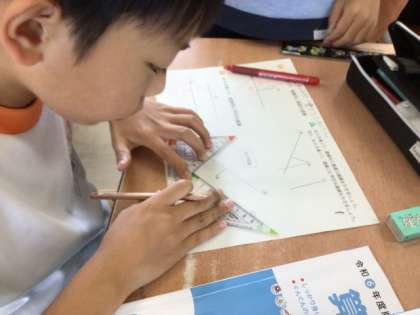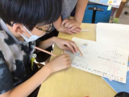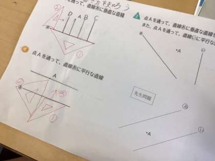 6/14の授業では、もととなる直線に垂直な直線や、平行な線を書く方法を学びました。児童は、三角定規を2つ使ってていねいにずらし、垂直や平行な直線を書いていました。