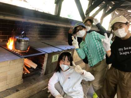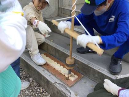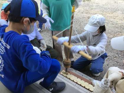いち、に、いち、に、のかけ声で火を起こしました。