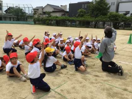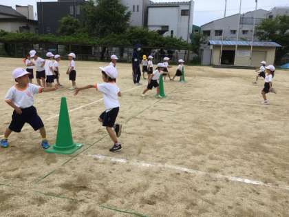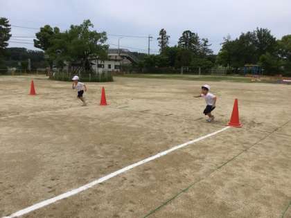 6/17の授業では、20m先においたコーンを回ってくるリレーを行いました。1回やってみて、「速く走るこつ」を考えて発表しました。「まっすぐ走るといいよ」「コーンを回るときに、体を倒すといいよ」「少しでも早くタッチするために、手をピンピンに伸ばすといいよ」などの意見がでました。