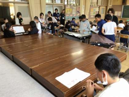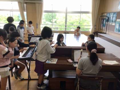 グループごとに、オルガン、リコーダー、鉄琴、木琴など児童が楽器を選び、練習を積んでいます。