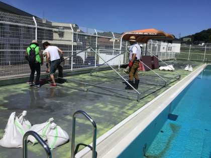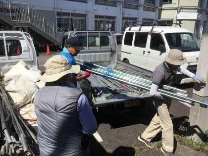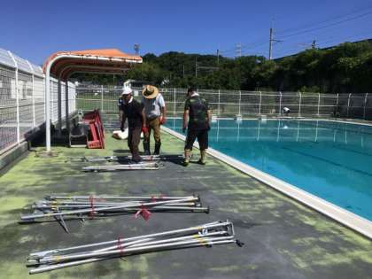 6/24(月)から始まる水泳授業に向けて、保護者・地域の皆様のボランティアで、プールサイドにテントを5張り立てていただきました。