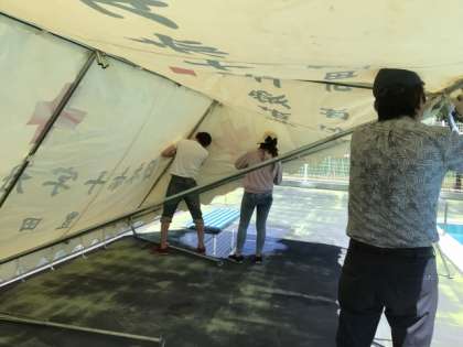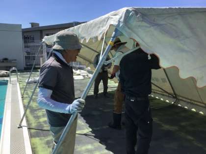近年、猛暑日が続くことが多くなり、熱中症を防ぐために、プールサイドにテントが必要でした。6/19(水)は、暑い中でしたが、12名のボランティアが集まり、テントを立て、飛ばないように土嚢を括りつけ、フェンスに固定しました。