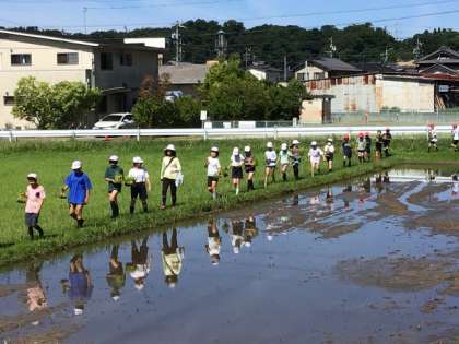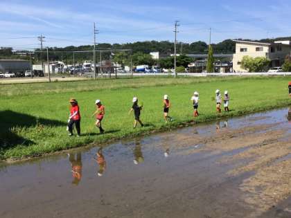 児童は田んぼのあぜ道を1列になって進み、田んぼに入りました。