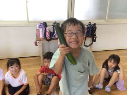 6/26、1年生は 野菜の収穫を行いました。1年生は、みんなで仲良く分け合いました。