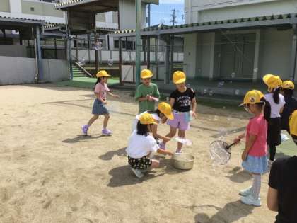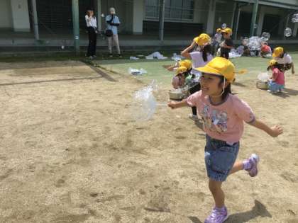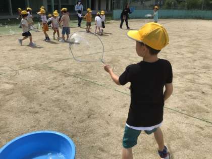 6/27は、運動場で思いっきりシャボン玉を飛ばしました。シャボン玉器具を手に走り回ると、たくさんのシャボン玉ができました。