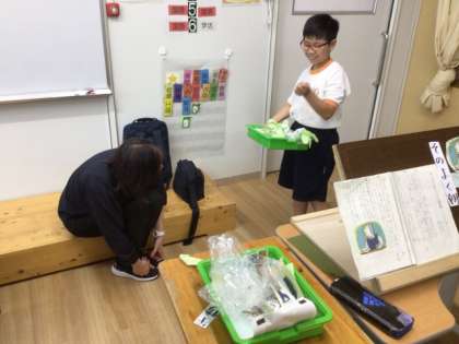 6/28の授業では、教科書を音読しながら、児童がお話の登場人物の動きを劇のように演じました。登場人物の動きをよく考えていました。