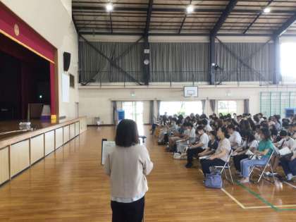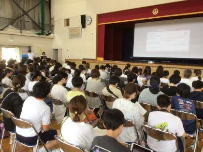 7/2に、6年生児童と保護者を対象に、修学旅行説明会を行いました。教員や旅行会社から、修学旅行で訪れる見学地や持ち物について、説明を行いました。