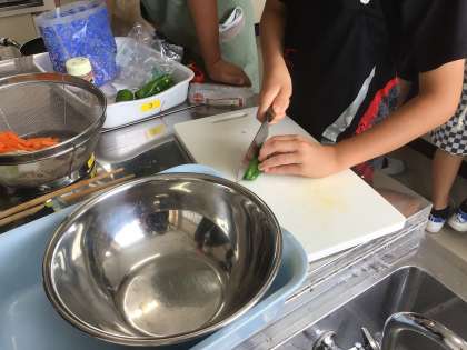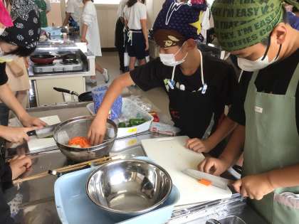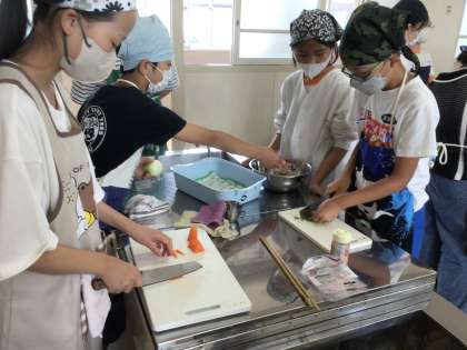6年生児童は、最初に手順を教わり、野菜を切り始めました。手を切らないように、慎重に切っていました。