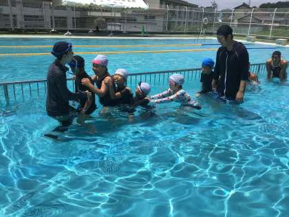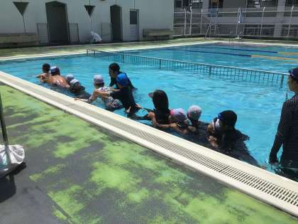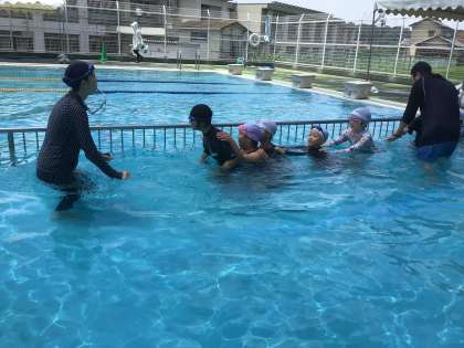 7/3、特別支援学級の体育では、水泳授業を行いました。最初に一列に連なってぐるぐると回り、洗濯機のような渦を作りました。