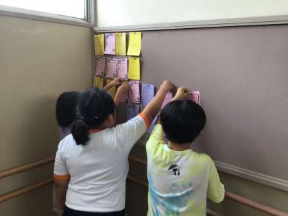 3時間目は、各クラスで振り返りを行いました。同じ班の友達に感謝の言葉を書きました。また、キラリ🌟友達カードに、友達の活躍を褒め称えるカードを書いて、校内に掲示しました。