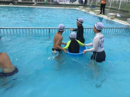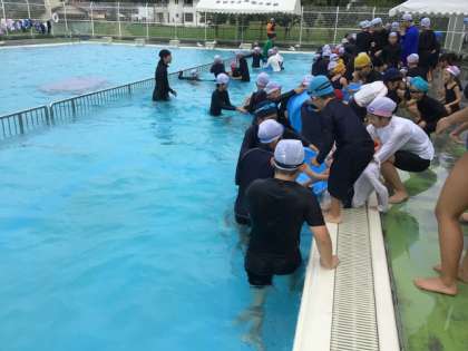 たらいレースは、フレンド班対抗で行いました。3〜4人の6年生が1年生1人をたらいに乗せ、低学年用プールを往復するリレーです。6年生は、たらいをひっくり返さないように気を付けて運んでいました。1年生のはじけるような笑顔が印象的でした。
